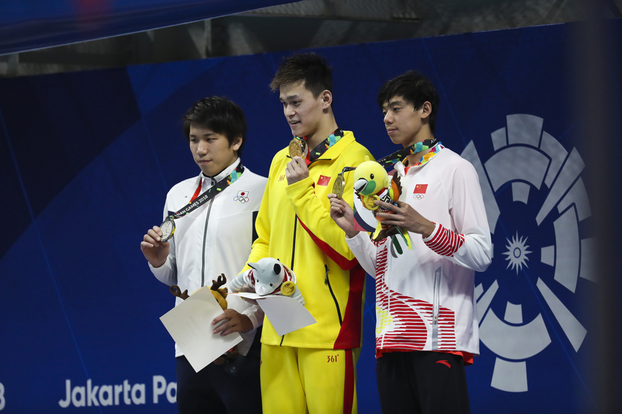 2018年雅加达亚运会,在200米自由泳颁奖仪式上,孙杨(中)并未穿着中国代表团统一的领奖服,而是换上了其个人代言品牌的黄色领奖服(视觉中国)